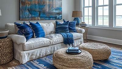 在美式海滨风格的客厅设计中,合理的布局设计也是非常重要的。例如,可以将沙发放在窗户旁边,享受自然光线和美景。还需要注意家具和装饰品的高度和宽度的合理搭配,以确保使用的方便性和舒适度。